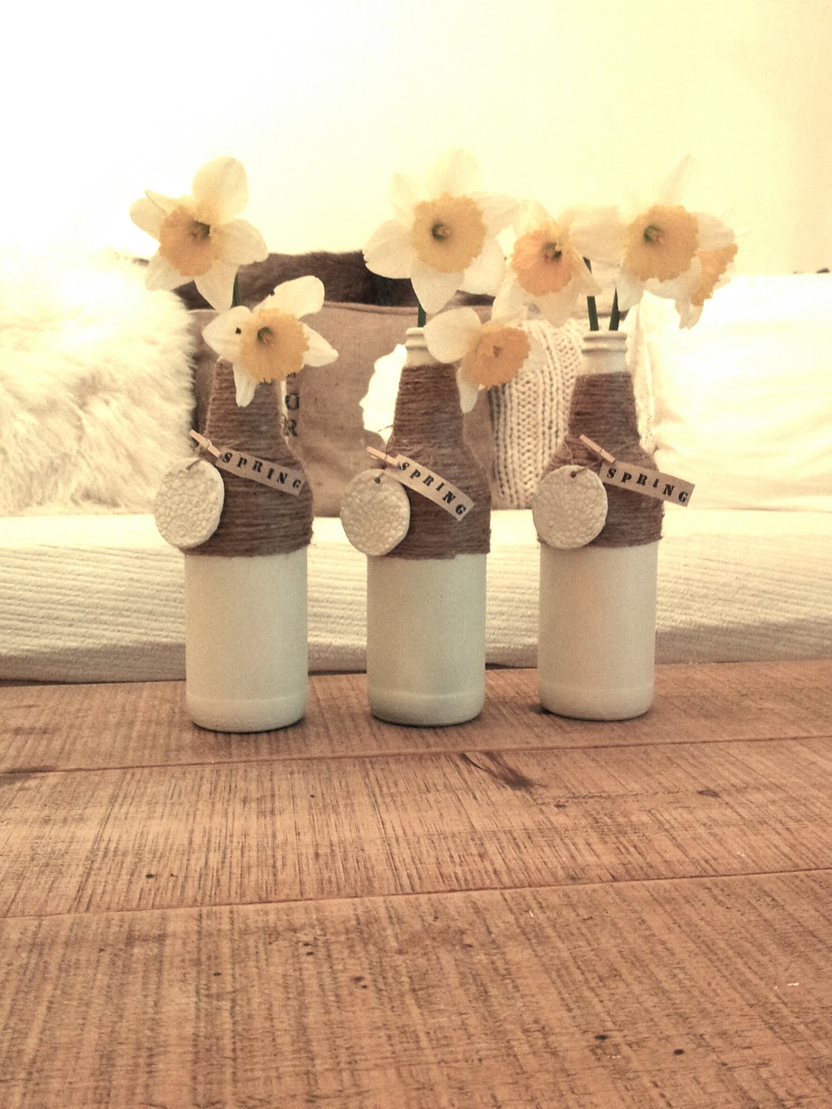 i spray painted 3 empty bottles then i used a glue gun, and started winding the jute string around it.