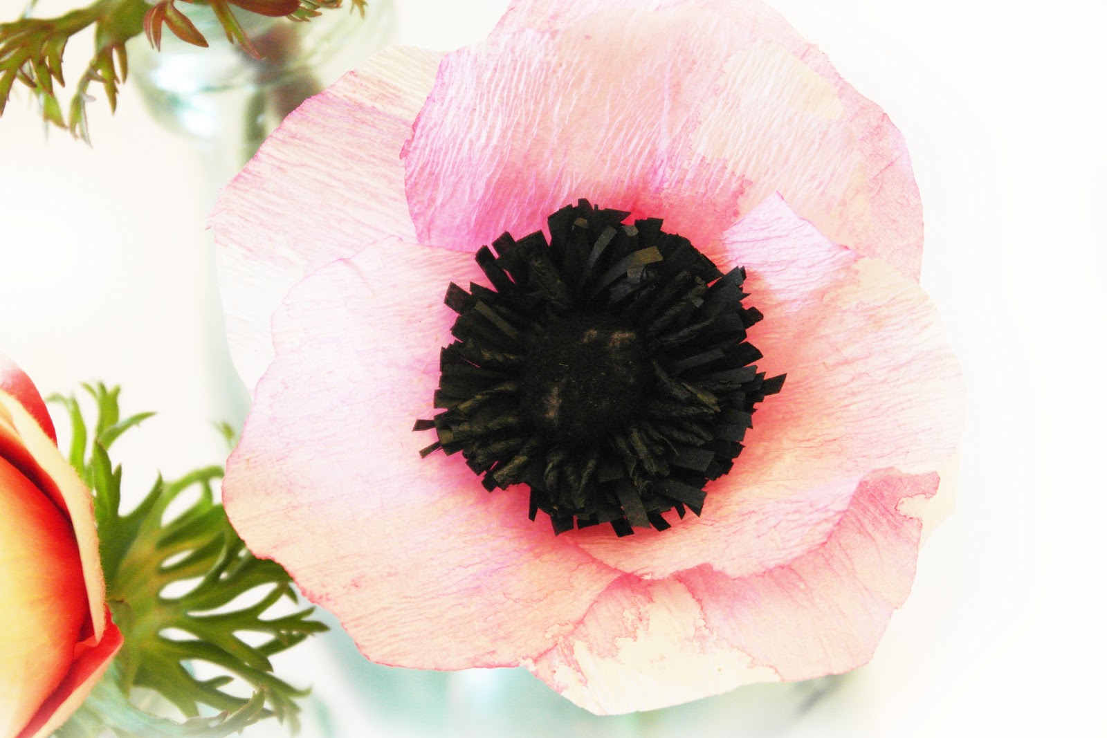 cut the white crepe paper into petal shapes and paint them with pink water colour paint, and leave them to dry