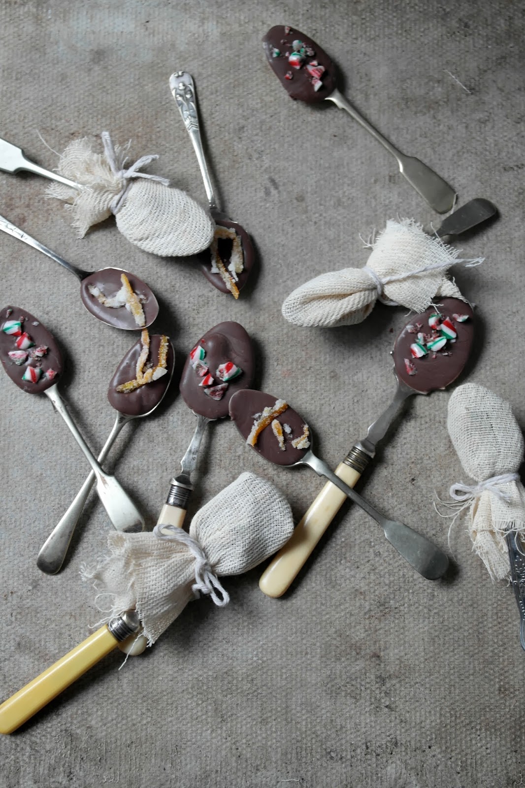 all you need to do is melt some chocolate and pour it on to each spoon then sprinkle on some crushed candy cane or candied orange peel or marshmallows (anything you want)