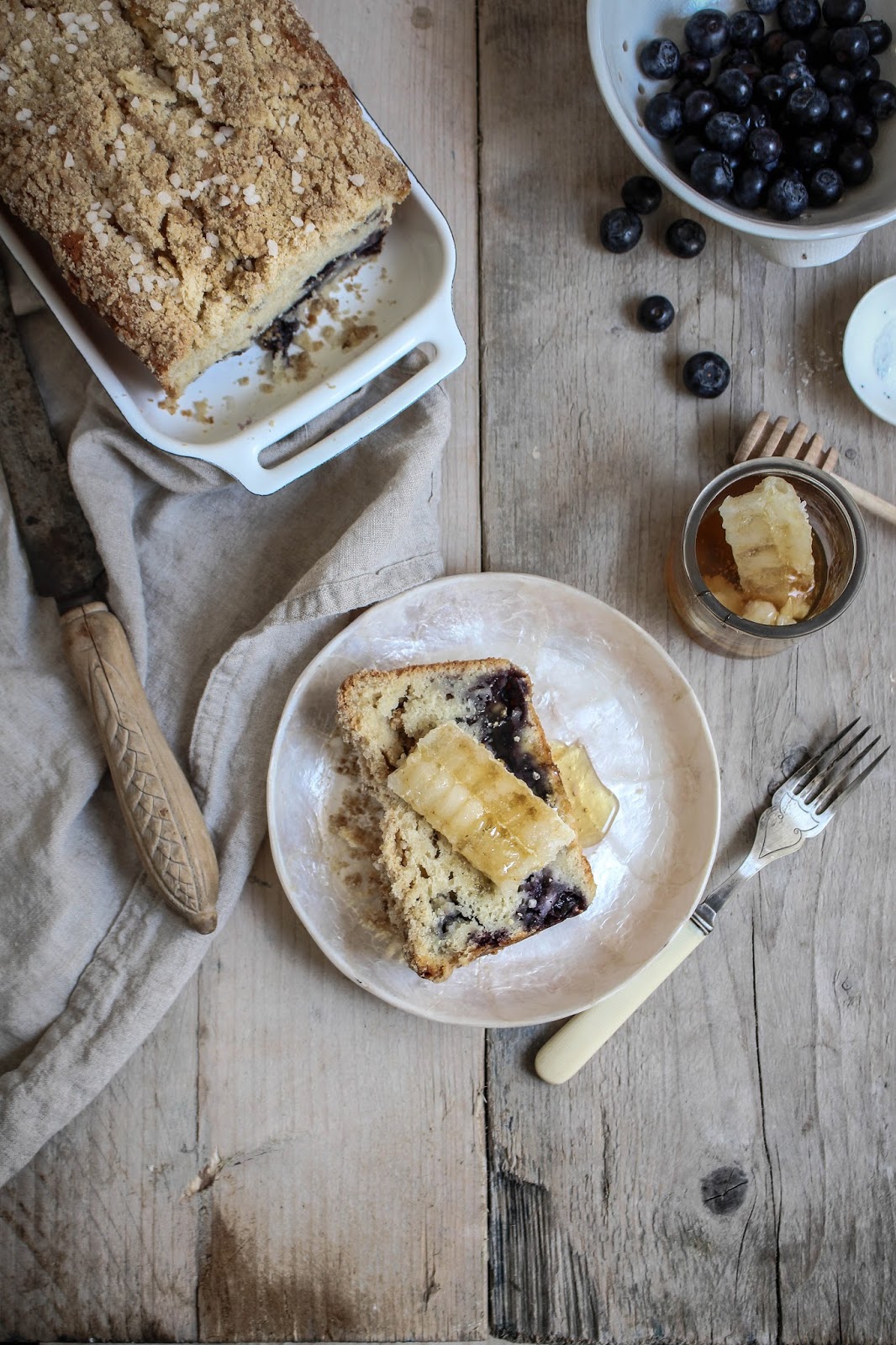 I love blueberry muffins but I thought I would make a loaf with the cake batter instead as i was dying to have a slice of cake slathered in honey with a big chunk of cut comb honey on sprinkled with salt and I didn’t think a Muffin would cut it.